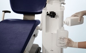 Pour protéger le dentiste, le patient et l'environnement contre la contamination croisée. La désinfection permanente de l'eau permet de traiter en permanence avec un désinfectant les canaux d'eau, l'eau de pulvérisation des instruments et l'eau de rinçage de la bouche. Les fonctionnalités de déconnexion novatrices protègent l'eau de la ville contre la contamination.